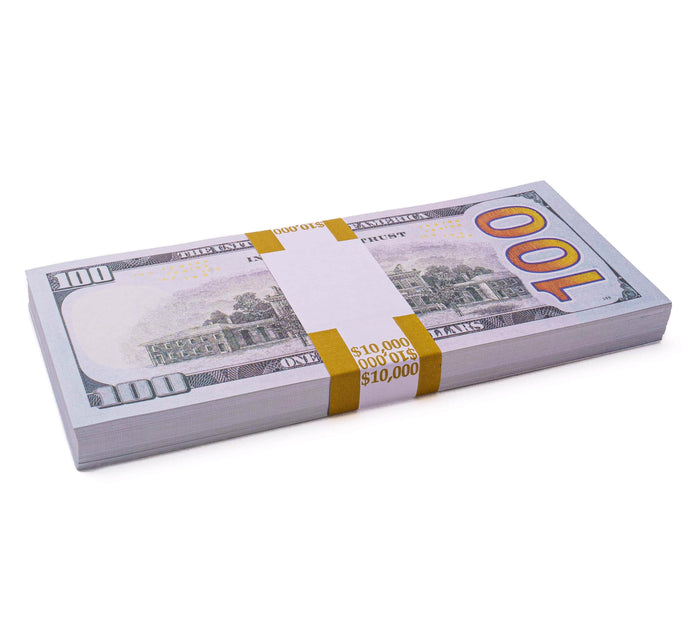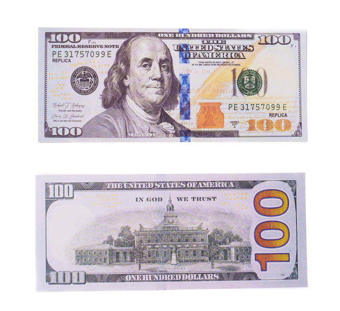Each stack includes 100 bills with currency strap.- Double-Sided Full Print